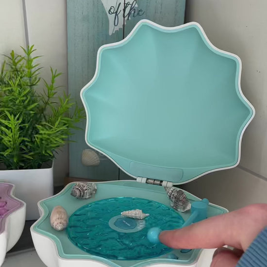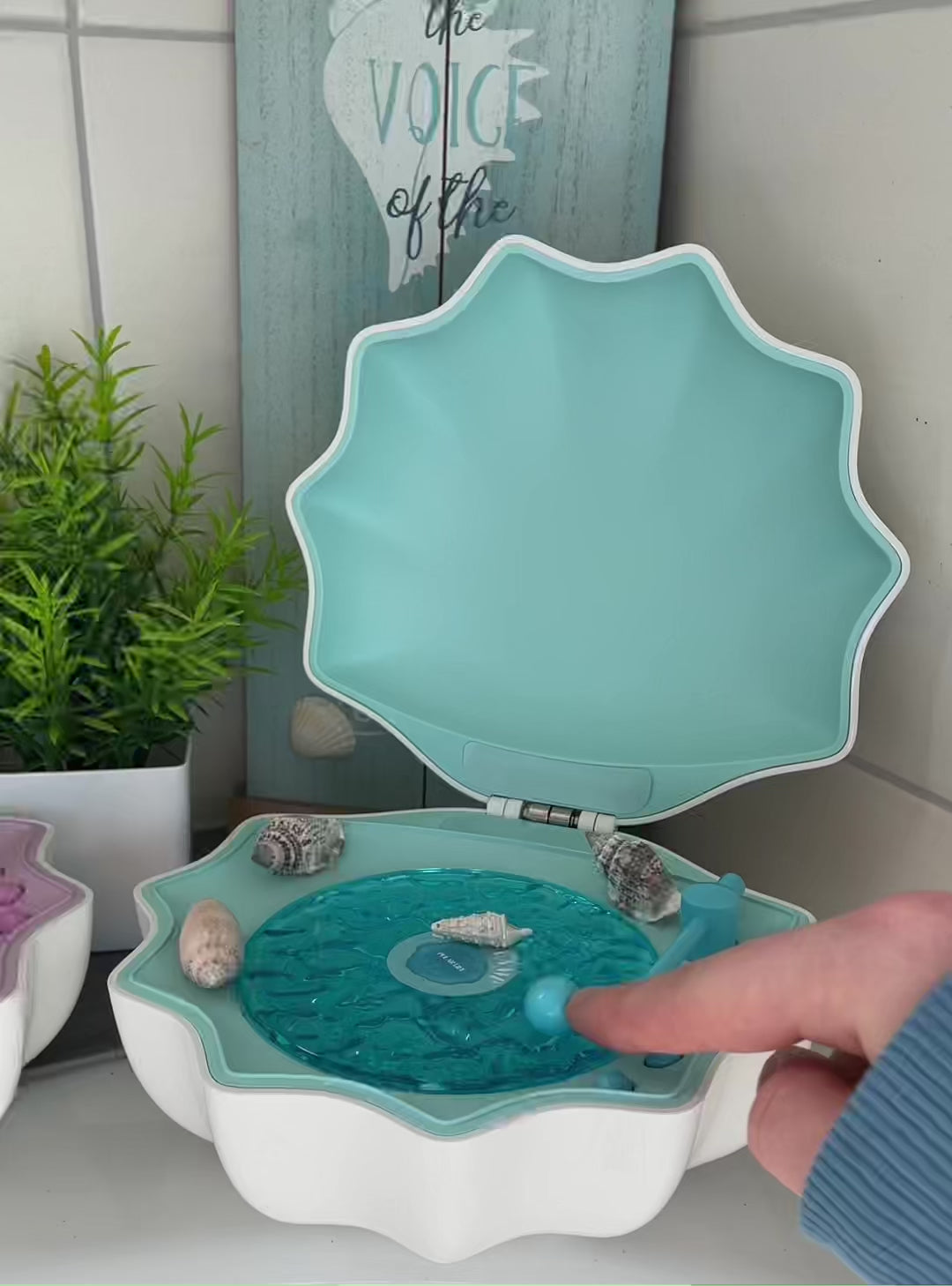 Put on the little turntable and connect to the Shell Wave via Bluetooth. The record player will start spinning when music plays.
