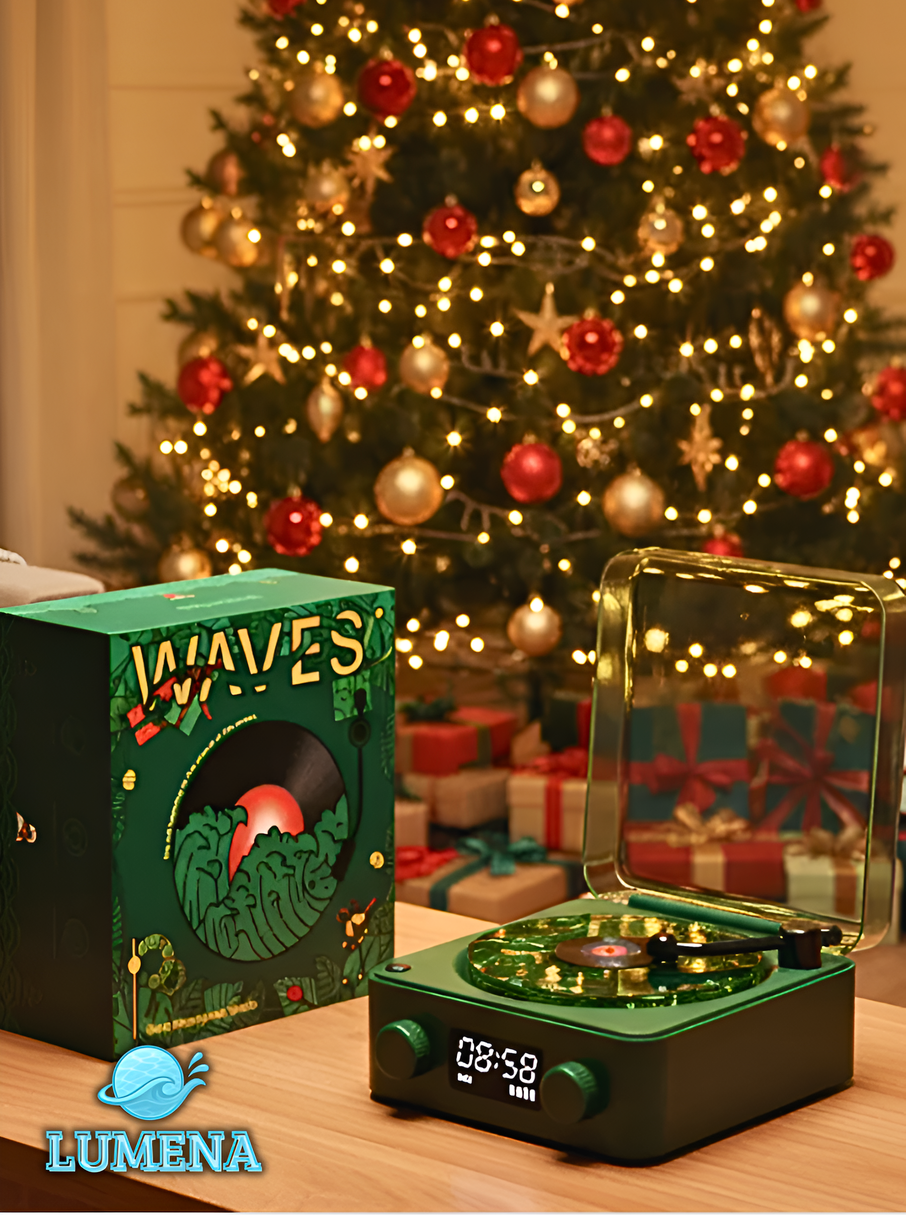 Put on the little turntable and connect to the Retro Wave via Bluetooth. The record player will start spinning when music plays.